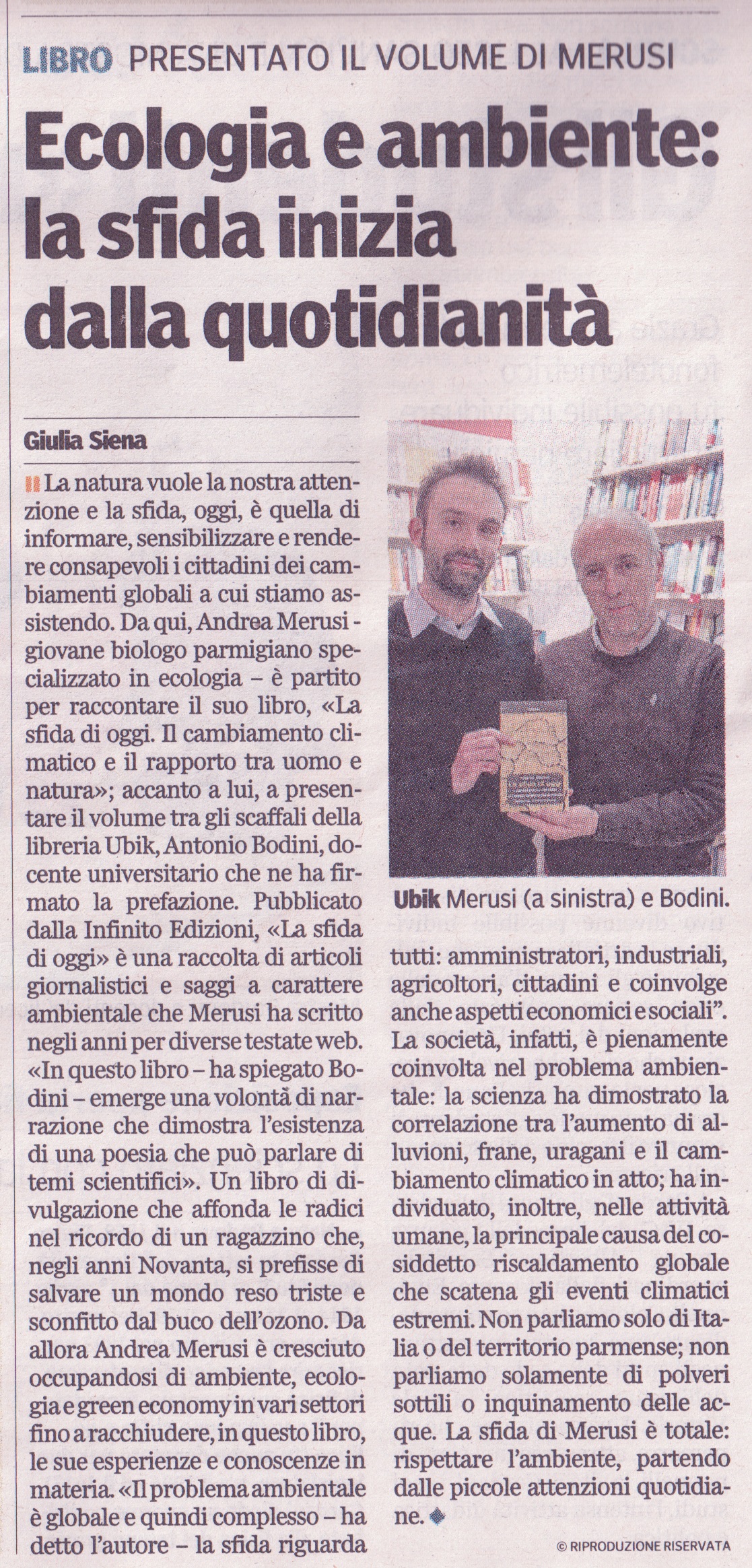 Nella mia Parma “la prima” è stata un successo. Almeno così mi è sembrato considerando che i posti a sedere della libreria erano esauriti come anche le copie del libro presenti. E comunque è stata una bella occasione per essere nuovamente interrogato dal prof. Antonio Bodini con cui durante l’Università ho sostenuto la bellezza di tre esami e ho lavorato per più di un anno alla realizzazione della tesi. Bodini è un bravo professore e un ottimo ricercatore. Sono contento che la serata verrà ricordata dall’articolo che riporto qui a fianco, scritto da Giulia Siena per la Gazzetta di Parma. Un pezzo che rende bene lo scopo del mio libro.