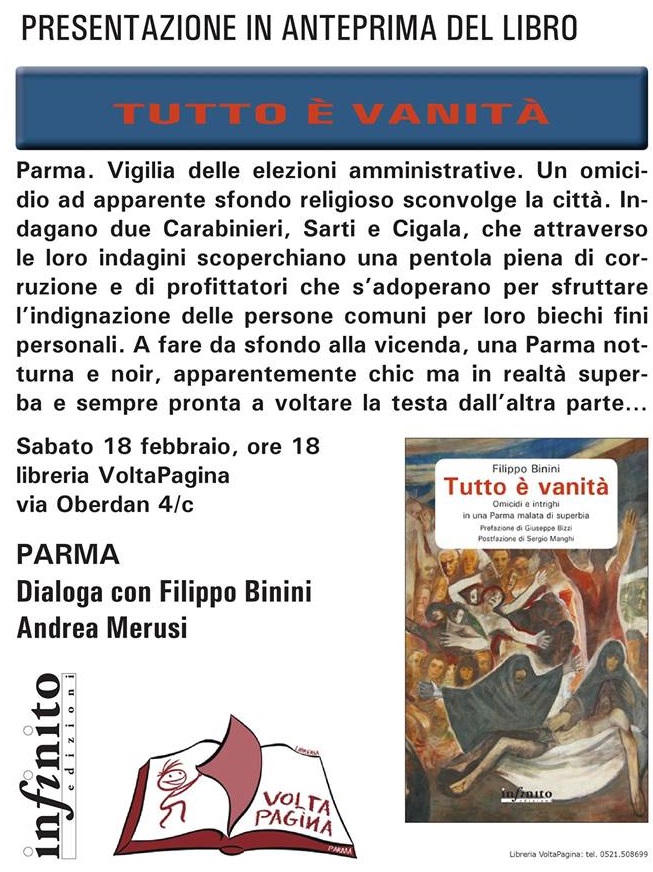 Cari lettori, questo è un appuntamento che non potete proprio perdere. Sabato 18 febbraio ci sarà la presentazione, in anteprima, del libro “Tutto è vanità” di Filippo Binini.