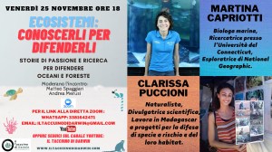 L’appuntamento del 25 novembre avrà come protagoniste Martina Capriotti e Clarissa Puccioni, entrambe appassionate di viaggi e accomunate dalla volontà di dedicare la propria vita allo studio e alla scoperta di mondi lontani e spesso nascosti sotto la superficie dell’acqua o nei meandri di una foresta. Ecosistemi fragili che grazie a progetti di ricerca e alla crescente consapevolezza delle persone possono essere salvati. Tutto questo è possibile se si ha una dote, l’empatia, che porta a stare a contatto con la natura e a fare ricerca sul campo, ne è un esempio Martina Capriotti che dopo la laurea in Biologia Marina è diventata esploratrice della National Geographic e ricercatrice della campagna Sky Ocean Rescue, mentre Clarissa Puccioni, naturalista e divulgatrice scientifica, ha deciso di trasferirsi in Madagascar dove monitora un progetto per la salvaguardia dei lemuri indri e del loro habitat e dove coordina il Global Butterfly Census Program, un’iniziativa dedicata all’identificazione delle farfalle attraverso la quale si può contribuire ai progetti di salvaguardia dei loro ecosistemi. Attraverso la loro testimonianza scopriremo quali sono le motivazioni alla base del loro percorso, qual è lo stato di salute degli oceani e delle foreste e delle specie che vi abitano e quanto è importante impegnarsi e creare consapevolezza dei cambiamenti in atto attraverso un serio lavoro di divulgazione scientifica.