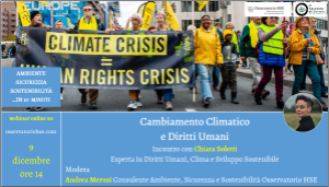 Il secondo appuntamento si terrà venerdì 9 dicembre, alle ore 14, e tratterà il tema: “Cambiamento Climatico e Diritti Umani”. Ospite dell’incontro sarà Chiara Soletti, esperta in Diritti Umani, Clima e Sviluppo Sostenibile.