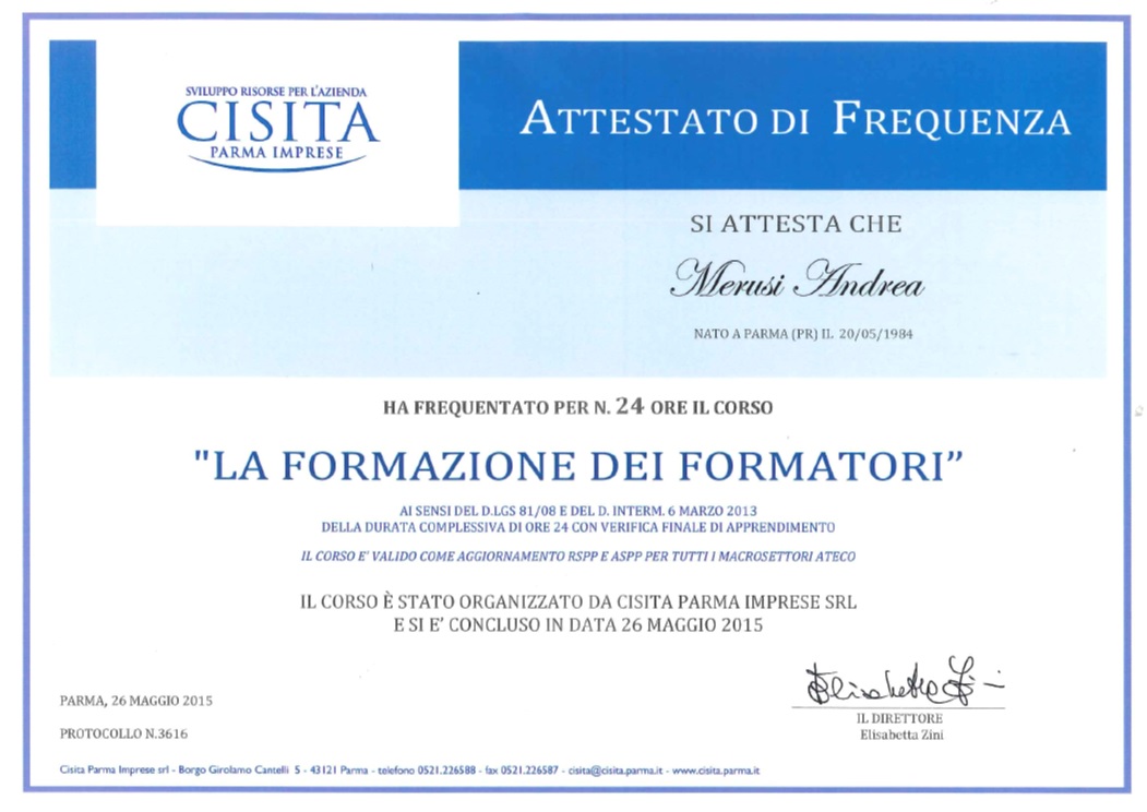Attestato di Docente FORMATORE Sicurezza sul Lavoro – maggio 2015
