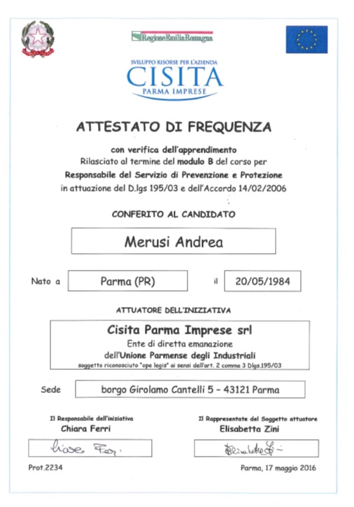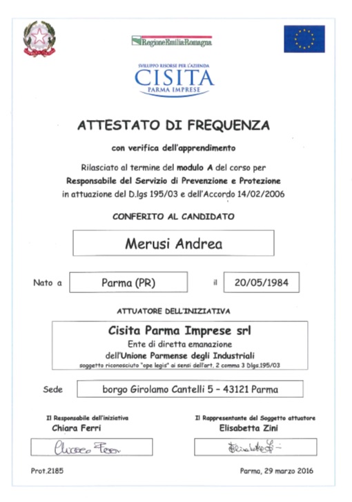 Attestato di Qualifica ASPP Addetto Servizio di Prevenzione e Protezione Modulo A e Modulo B – marzo 2016 e maggio 2016