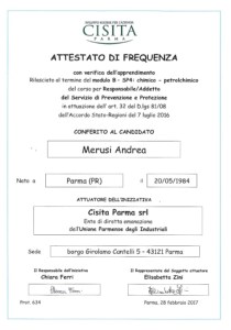 Attestato di Qualifica ASPP Addetto Servizio di Prevenzione e Protezione Modulo Chimico SP4 – febbraio 2017