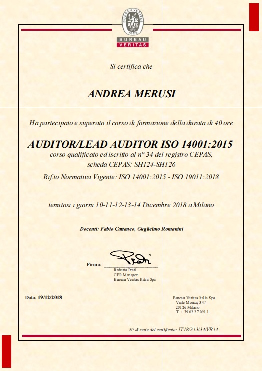 LEAD AUDITOR Sistema di Gestione Ambientale ISO 14001 – dicembre 2018